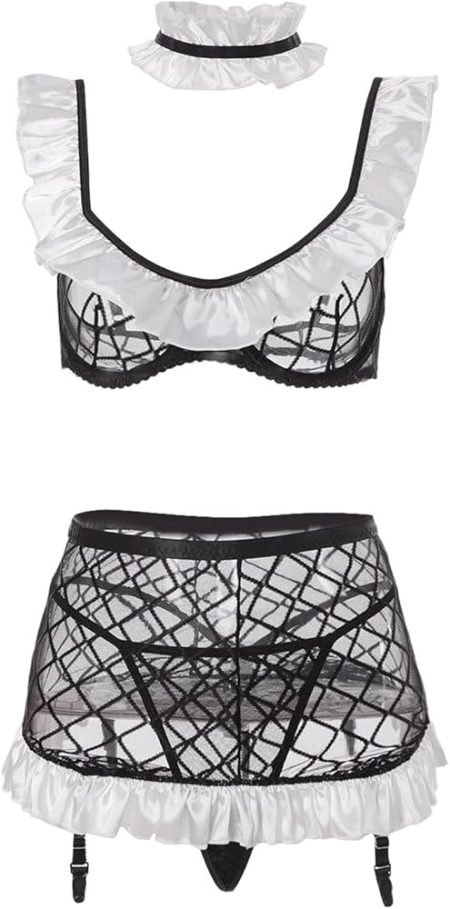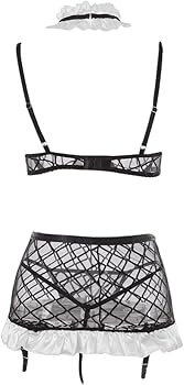 This sexy twist on the classic french maid role play includes a ruffled top, sheer diamond pattern mini skirt, thong, and neck piece. Perfect for adding some spice to your bedroom adventures. Who says "cleaning" can't be fun?!