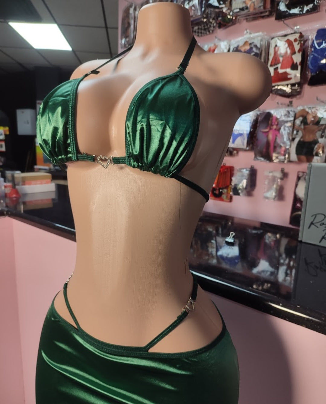 Includes bikini type bra (tie up), thong and bodycon mini skirt