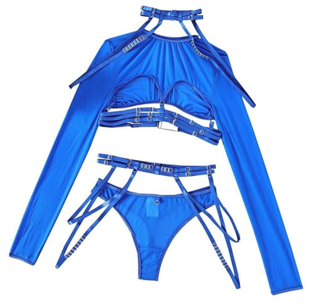Includes - choker, long sleeve open top, garter and undies